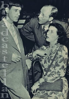 The real Hedy Lamarr, of course, was more than a “little noisemaker.” Not only was she an accomplished Hollywood actress, but an inventor as well. Together with theaforementioned composer George Antheil,, Lamarr (seen above with Ish Kabibble and Kay Kyser at a Command Performance broadcast) developed a patented radio control for torpedoes, based on the principle of “frequency hopping”; but the navy would not have anything to do with the invention . . . at least not until the patent had expired.