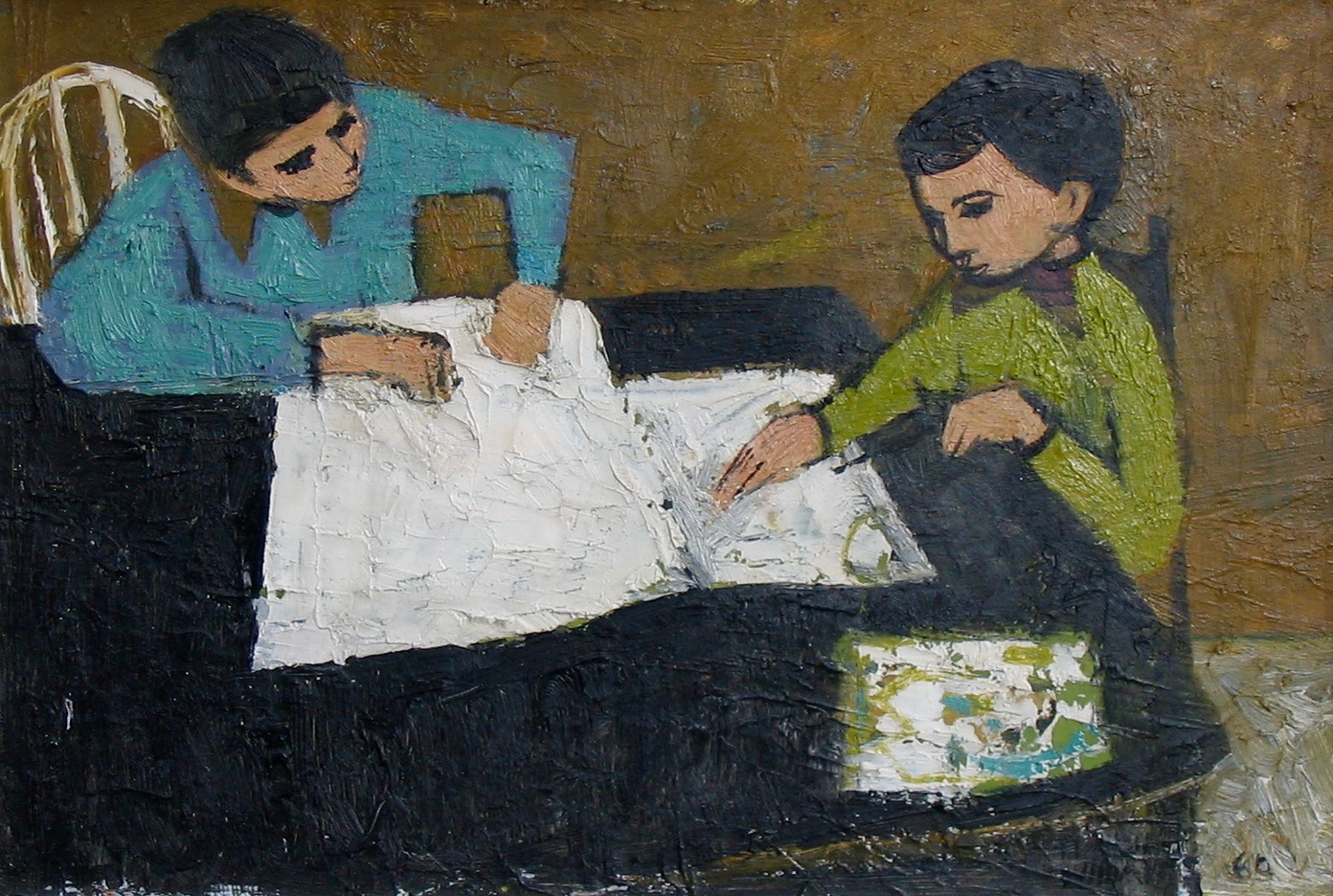 Now, I have, on a wall in my house, a reminder of Ceri’s lifelong creativity in the form of this painting of him by his mother, Claudia Williams. Here he is, aged six years old. And there he is, never mind how many years later. Ceri Pritchard has kept alive the urge to create by being alive to strangeness and by insisting on looking askance at “reality,” perched, as he is, on the edge.