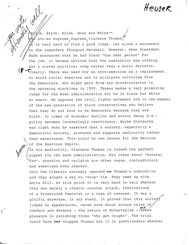 Now as then I am wary of methods employed to make the spectre of ideology manifest in a spectacle of politics, resulting in witch hunts by any other name.  “The trial could have stopped Thomas,” I allowed, “but it is questionable whether his replacement would have been a ‘better’ choice because,” I argued rather vaguely in the passive voice, “certain ideas about the position and influence of the judge of the Supreme Court are being held that do no longer allow liberal thinking.”