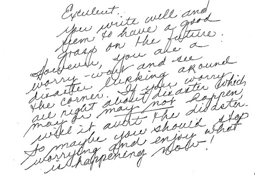 “… you are a worry-wart and see disaster lurking around the corner,” one of my professors at BMCC wrote in her comments on an essay assignment.  She was right, which is precisely why I could not heed her advice to “stop worrying and enjoy what is happening now!” My writing assignments, for English classes in particular, often encouraged critical engagement with that evolving and not altogether joyful now.