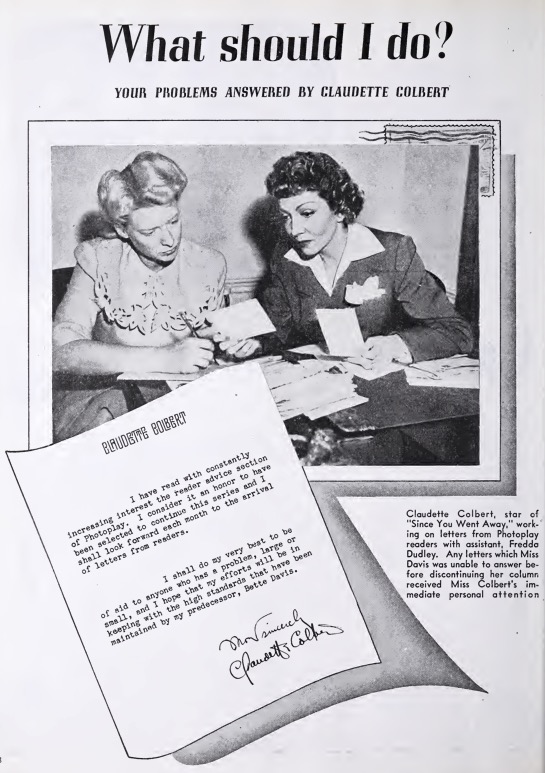Turns out, Colbert was taking the oath of a post office left vacant by a Hollywood legend. “I hope that my efforts will be in keeping with the high standards that have been maintained by my predecessor, Bette Davis,” the “What Should I Do?” column opened in January 1944, now bearing the reassuring subtitle “Your Problems Answered by Claudette Colbert.” In turn, Davis would more than live up to the “high standards” set by Colbert, snatching from the latter the leading role in All About Eve before ending up “writing a letter to daddy” (the address being “heaven above”) in the grand-mommie dearest of all hagsploitation movies Whatever Happened to Baby Jane.