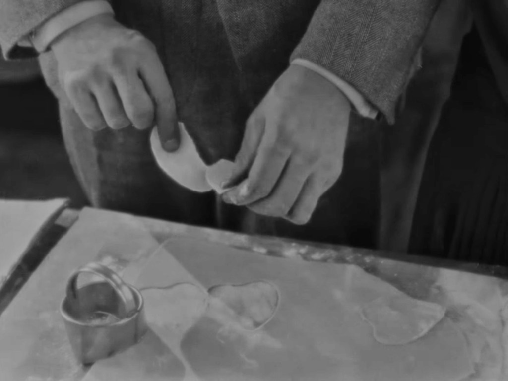 In the Buntings’ kitchen, as Mother Bunting puts down her rolling pin, we witness the off-duty officer using a cookie-cutter approach to courtship when he throws a piece of heart-shaped dough in the direction of Daisy, who is unimpressed by the gesture. His hands then tear the ersatz heart in half, and Joe proves unable to mend his own without tearing Daisy from the lodger, who, through the law’s wilful mishandling of the case, risks being torn to pieces by an angry mob.