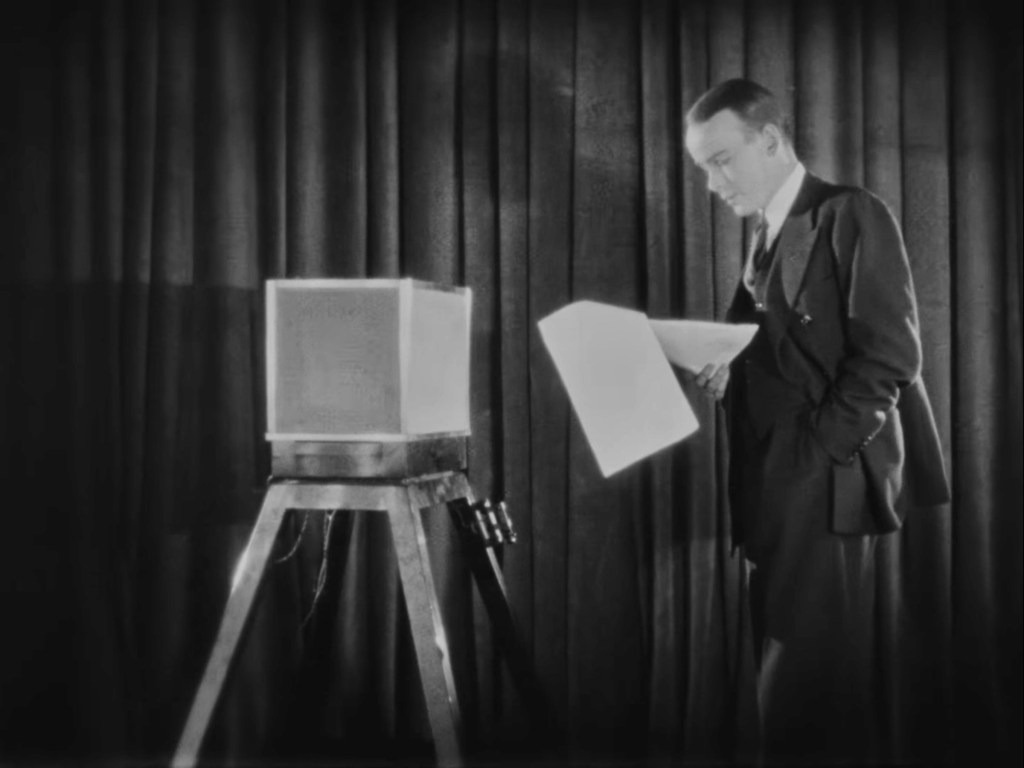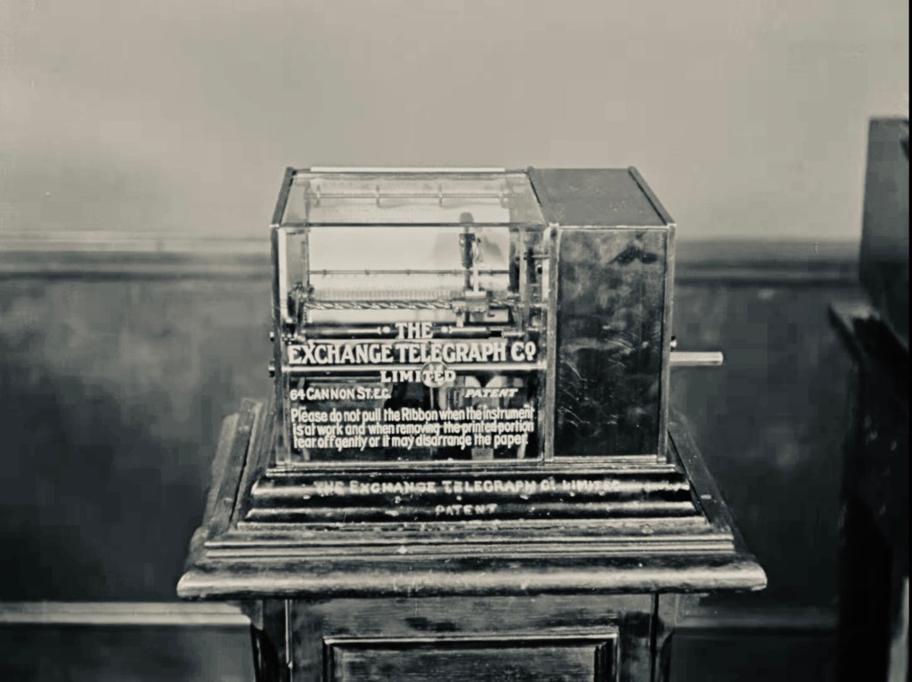In an elaborate montage showing the arsenal of modern communication technology at work—the printing press, the telegraph, the telephone, the wireless and the electric news ticker—close-ups of isolated figures in the firing line of communication inspire little confidence in the benefits of its workings.