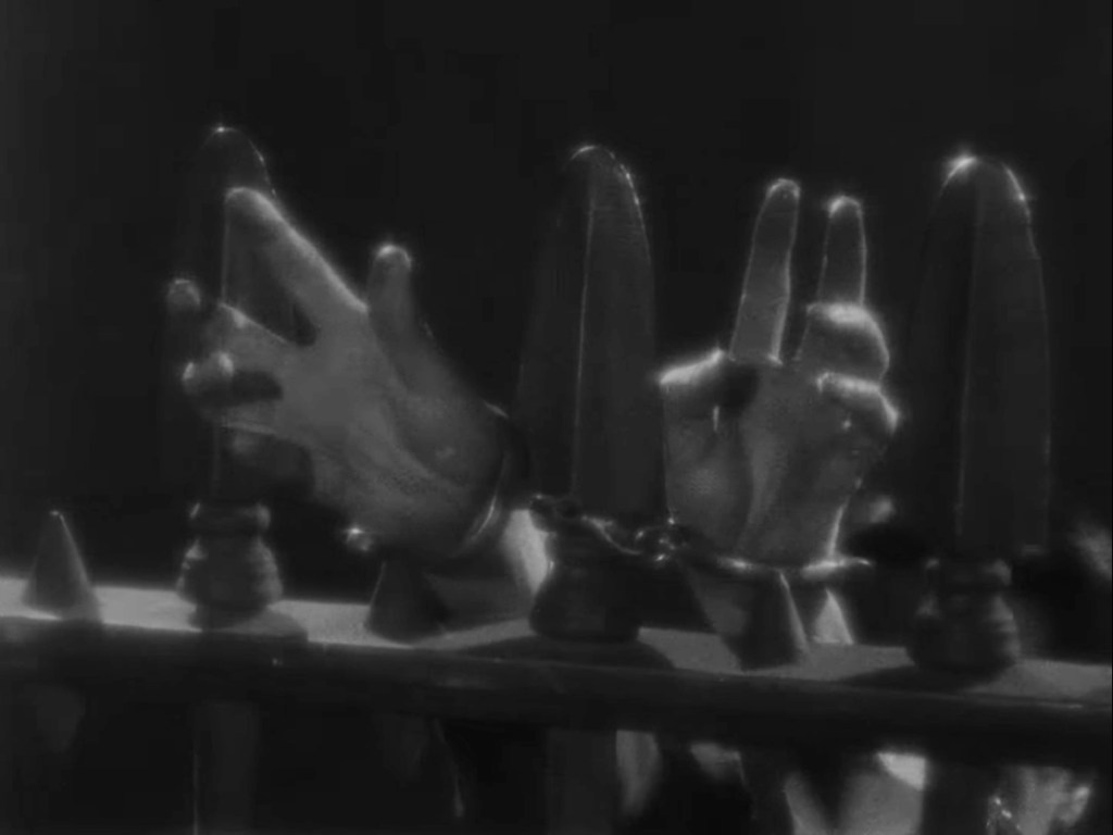 Later, we see one hand cuffed to the other, dangling from the rails of a cast-iron fence.