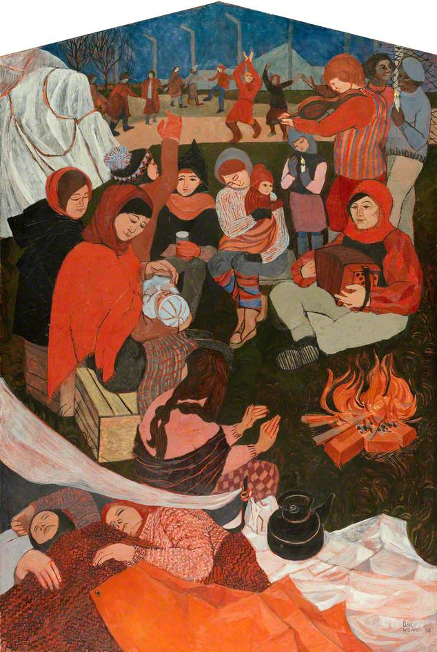 Williams produced many of her most ambitious works after the age of 50. In 1984, she painted Greenham Peace Vigil, now in the National Library of Wales. She had visited Greenham Common in Newbury, Berkshire on several occasions in support of the Women’s Peace Camp erected there in 1981 to demonstrate against the deployment of nuclear tomahawk cruise missiles at the site. Williams’ painting is characteristically celebratory, with clear religious overtones. Williams had converted to Catholicism in 1956 and drew strength from her faith.