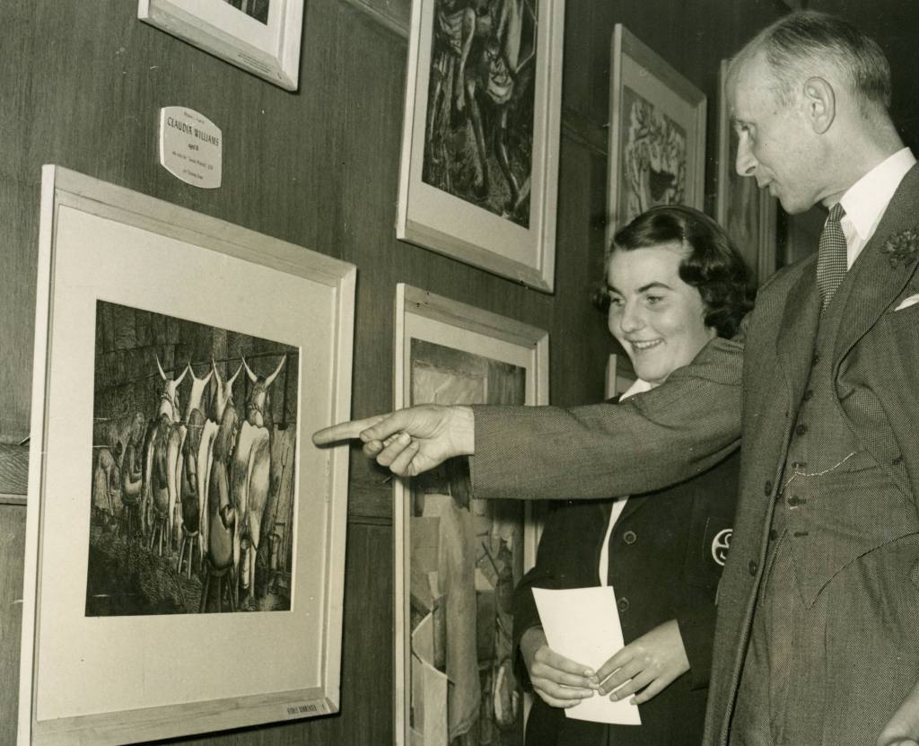 Williams with Sir Philip James, director of the Arts Council of Great Britain, in front of her winning composition Milking (1949)