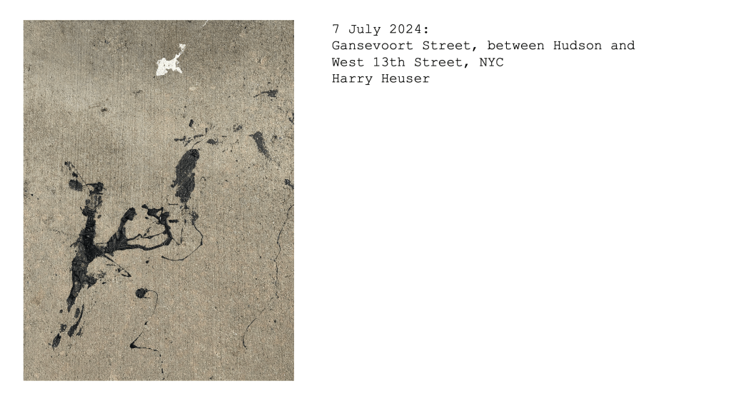 Additional pictures, sent by me via email or WeTransfer to the gallery while abroad, along with solicited contributions by visitors to the gallery, are shown as a digital slide show. As in its previous iteration, Asphalt Expressionism also features one of the images as a vinyl print on the floor of the gallery to encourage, like Yoko Ono’s A Work to Be Stepped On (1960–61), reflections on our engagement with art and the questioning of artwork as permanent, finished products.