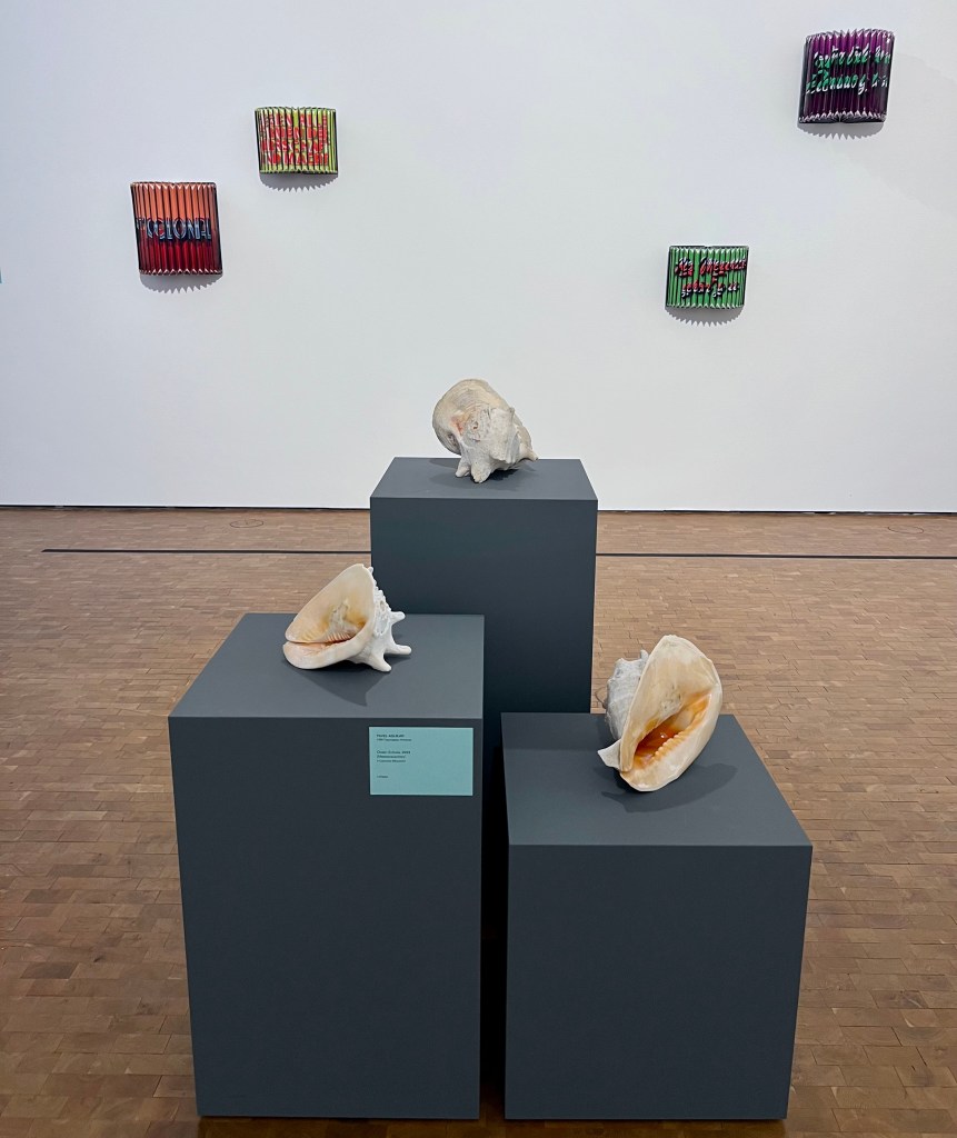 Unlike the accordion bellows, the shell trumpets placed in the center of the same gallery are unadorned readymades. Far from being “alien substances” in the “organism” of the museum—to use the hateful terminology with which museum director Thomas Messer justified the cancellation of Hans Haacke’s 1971 exhibition at the Guggenheim—their presence in an art museum no longer seems to require justification.