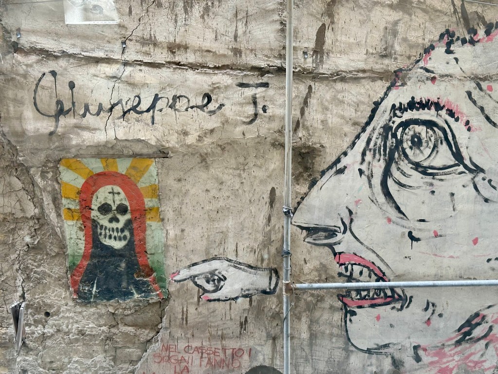 In Naples, I was attracted equally by the paintings housed in centuries-old places of worship as I was by the graffiti that now covers the façades of those houses. Both visual practices—painting and graffiti—are local; but whereas one represents the “traditional,” the other confronts or affronts it, along with the sensibilities of those who prefer their culture riveted in place and time, despite the fact that murals, old and new, can be found all over the place. “Fresco” means “fresh”—but I am aware that this does not apply to its date of execution or to the relevance of its subject matter to our times.
