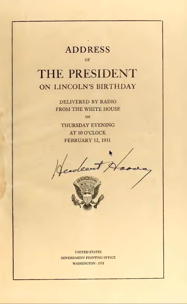 “By the magic of the radio.” Suitably charming if by then well-worn, the phrase served as the opening of a public address by the thirty-first president of the United States, Herbert Hoover. Broadcast from the White House on this day, 12 February, in 1931, and occasioned by the birthday of Abraham Lincoln, the message conveyed in the speech that followed was decidedly less magical than the purported medium of enchantment by way of which it was delivered.
