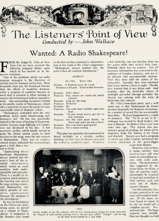 This gap—a lacuna not quite matata—leaves me, if not speechless, so at least without confidence adequately to respond to “Wanted: A Radio Shakespeare,” one such early second-hand account of radio listening. The article was published in the March 1926 issue of Radio Broadcasting as part of a tauntingly titled column “The Listener’s Point of View,” as represented by John Wallace, a critic whose remarks on the first radio play published in the United States I previously mentioned here.