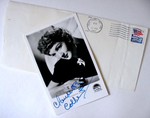 Many collectors of memorabilia live vicariously through their acquisitions. They imagine the past and private lives of the mementos they keep. I never met Claudette Colbert. During my first year at college, I wrote a speech about the actress, which I sent to her home in Barbados. Weeks later, I received the autographed postcard shown elsewhere in this gallery [and pictured left]. Though not personalised, it takes pride of place in my study.