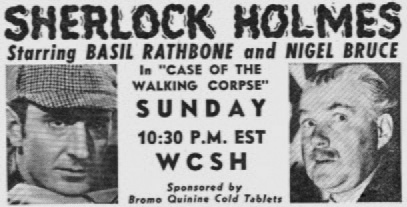 Holmes survived Gillette’s death in 1937 and continued for another decade to solve mysteries on US radio, even though he had to face plenty of competition on the blood-speckled bandwidths. Like the motion picture series starring Basil Rathbone and Nigel Bruce, the Holmes adventures on the air also played an important role in home front motivation, endearing Americans to their at times veddy peculiar and snobby sounding allies in Britain. After the war, the British reclaimed Holmes and continued to dramatize his adventures on BBC radio.
