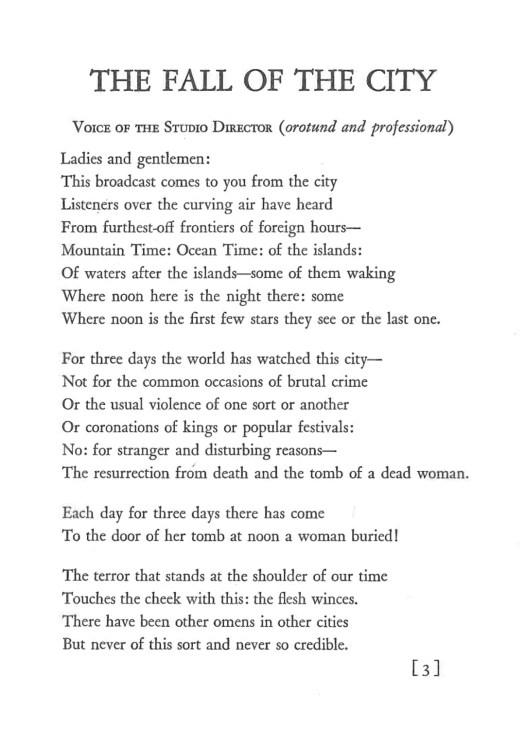 “Ladies and gentlemen,” the play begins, “This broadcast comes to you from the city,” a town whose downfall is first announced, then actualized. It is talked into being as the figure of a radio announcer stands by to document the unfolding event. MacLeish’s announcer takes listeners to the “central plaza” of this unspecified city to become ear-witnesses to the resurrection of a recently buried woman who, for three consecutive days, appeared before a crowd of spectators, and who now utters a baffling prophesy: