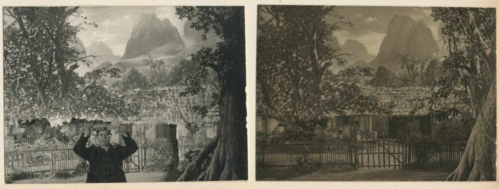 One of the photographs in the album shows a young man in a jungle setting that is partially painted. The man is a camera assistant. He is holding a clapperboard that bears the name of the director of photography, J. Roy Hunt.