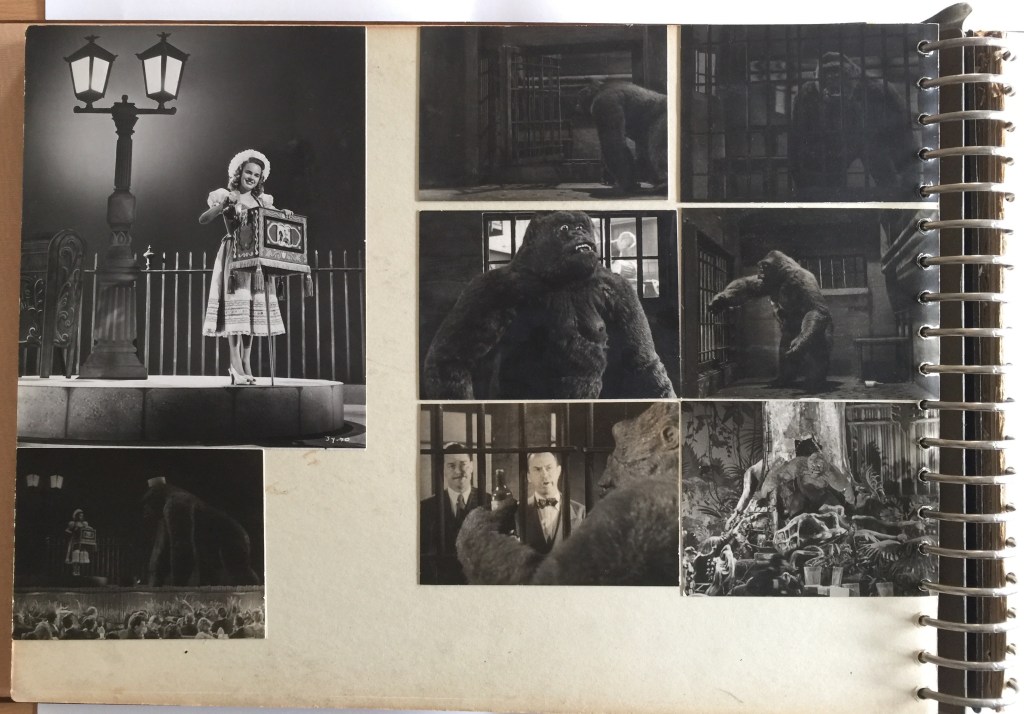 As a ‘technical creator,’ O’Brien was mainly involved in the planning and preparation of Mighty Joe Young. Much of the animation – at least eighty per cent of it – was carried out by Harryhausen. Assistant Pete Peterson (shown elsewhere in the album with Joe) animated a few sequences, as did King Kong veteran Marcel Delgado, whose name can be found on the list of signatures also on display in this exhibition.