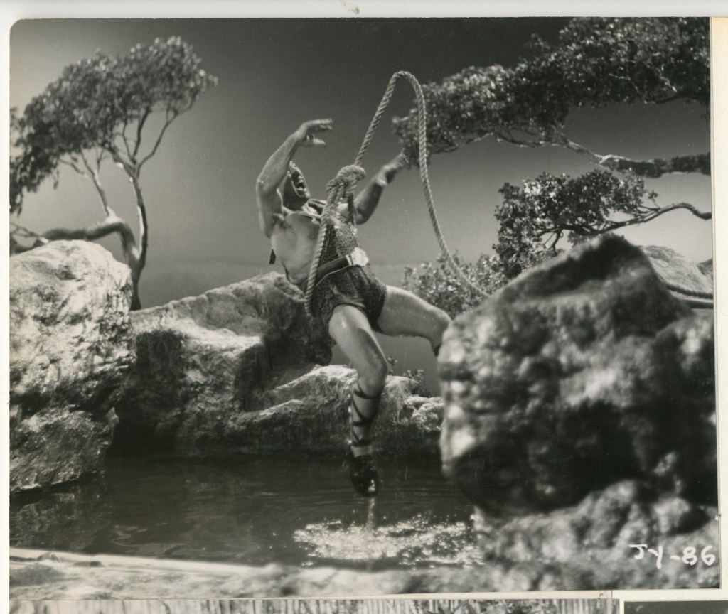 The figure of Joe standing on a rock is a miniature. His movements had to be matched with those of the strongmen and the rope as he pulls the men into a pool of water.