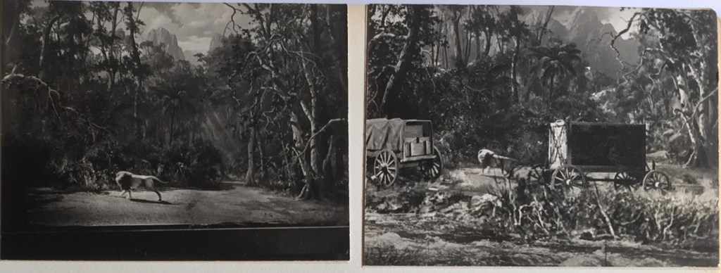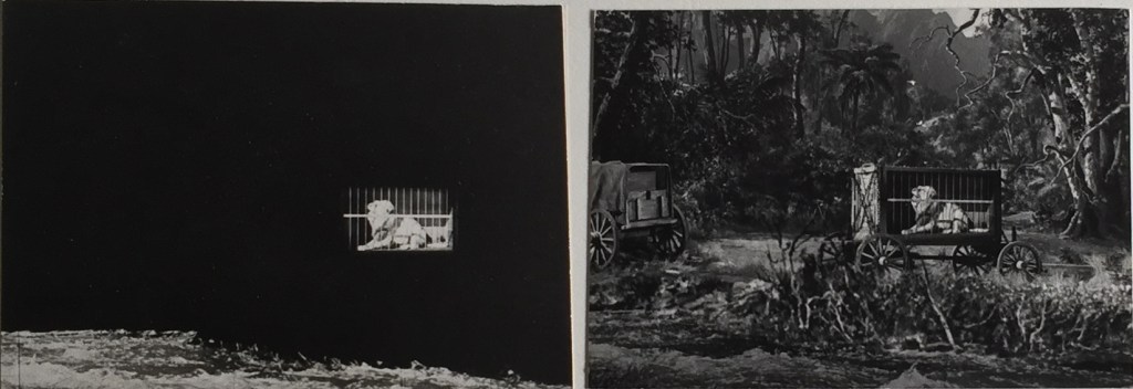 Early in the story, Joe discovers a caged lion in his native jungle. As Harryhausen explains in An Animated Life, Willis O’Brien shot live footage of a lion on a platform that could be rocked back and forth. The cage was a miniature. Studying O’Brien’s footage, Harryhausen counted the frames of the rocking sequence and matched them with the number frames he needed to animate Joe rocking the miniature cage. The real lion was projected on a screen within the miniature cage.