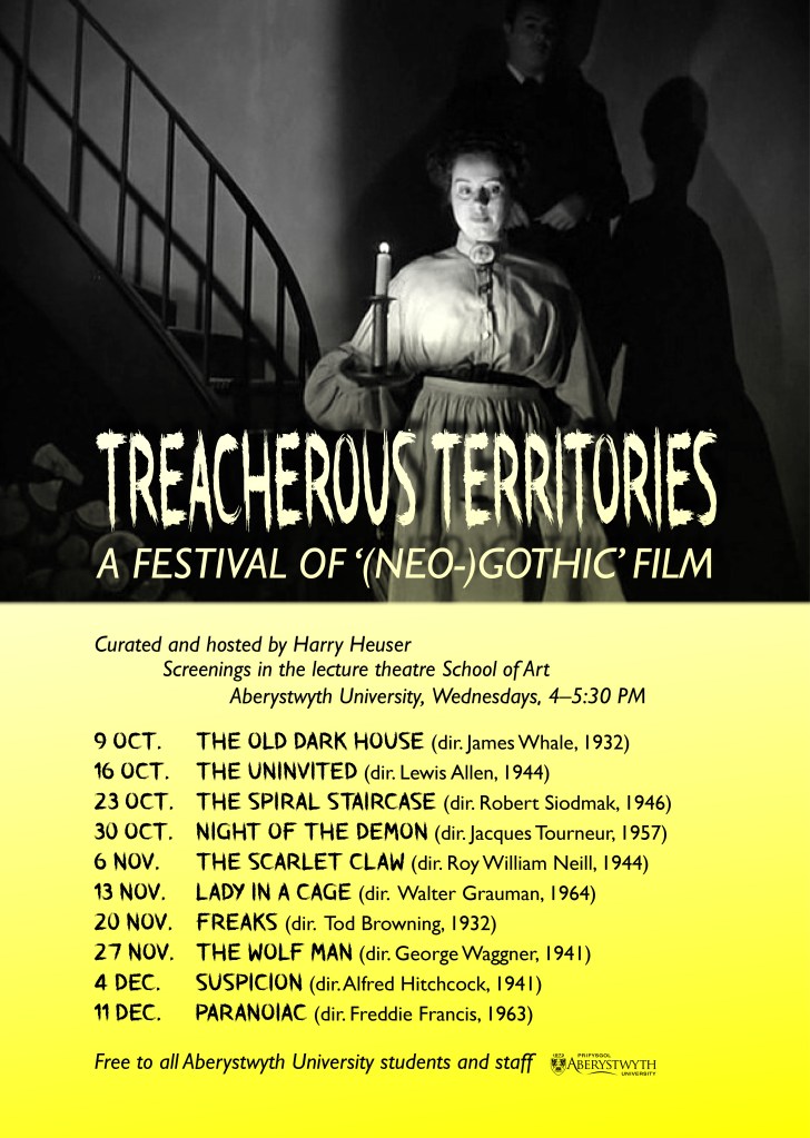 While the screenings are open to Aberystwyth University students and staff only, I aim to discuss the films in a series of blog posts, as I have in conjunction with the previous festival, Uneasy Threshold. Those earlier posts can be accessed here as well.