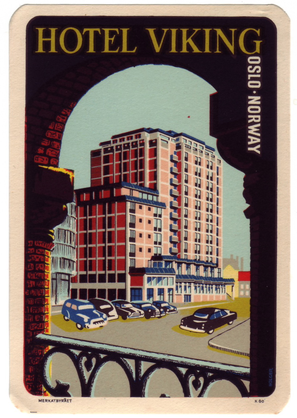 Resisting my cultural conditioning – the notion of vacationing, in my German childhood, being associated with going down south – I picked up the label promoting the Hotel Viking in Oslo. It opened in 1951, an influx of visitors being expected in 1952, the year Oslo hosted the Winter Olympics; it was the first year in which Germany (both East and West) were permitted to participate since Berlin hosted in 1936. Norwegians were not likely to relish the idea of uniformed German delegates and their concomitant supporters invading their capital. The label design frames the new site in a traditional context, suggesting that, even when viewed from more venerable landmarks, it is a sight to behold. The hotel, now called the Royal Christiania – thus declaring itself traditional by referencing the erstwhile name of the city – is still open for business. The label drives home that the hotel was modern by declaring it to be approachable by car; these days, advertisers are less likely to turn the parking space into a feature.